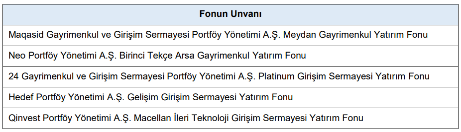 - Aşağıda unvanlarına yer verilen gayrimenkul yatırım fonları/girişim sermayesi yatırım fonlarının kuruluşlarına izin verilmesi ve katılma paylarının ihracına ilişkin ihraç belgelerinin onaylanması taleplerinin olumlu karşılanmasına karar verilmiştir.