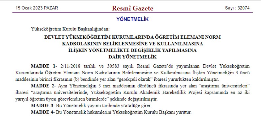 Devlet Yükseköğretim Kurumlarında Öğretim Elemanı Norm Kadrolarının Belirlenmesine ve Kullanılmasına İlişkin Yönetmelikte Değişiklik Yapılmasına Dair Yönetmelik, Resmi Gazete’de yayımlandı.