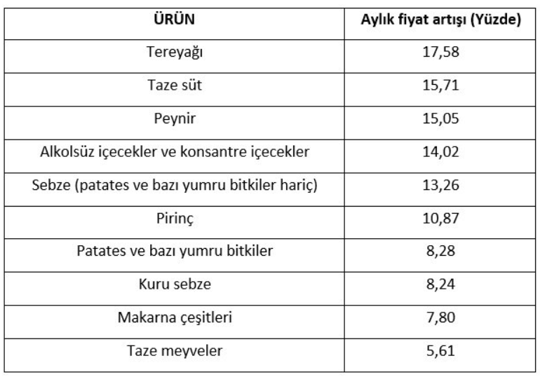 Gıda enflasyonuna en yüksek katkı ise süt ürünlerinden geldi. TÜİK verilerine göre, geçen ay tereyağındaki artışı yüzde 15,71 ile taze süt, yüzde 15,05 ile peynir izledi.