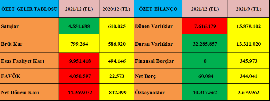 - Rasyoları olumsuz, 2020 yılında yakaladığı ivmeyi 2021 yılında kaybetmiş.