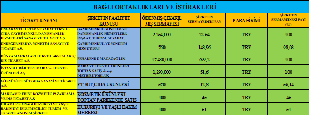 Şirketin iştirakleri; Dünya Markaları Tekstil Aksesuar İç ve Dış Ticaret AŞ, İstanbul Bijuteri Moda Ve Tekstil Ürünleri A.Ş. ve Nova Organizasyon ve Turizm A.Ş.’dir.